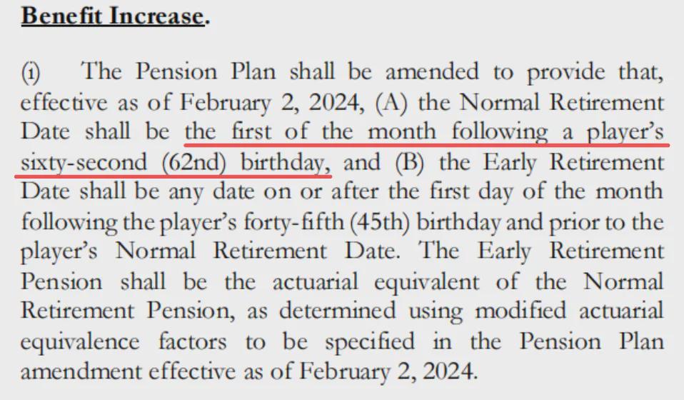 NBA劳资协议条款里明确指出:正常退休日期应为球员62岁生日后的第一个月的第一天;但同样可以选择从45岁生日次月的第一天到正常退休日期前的任意一天。早领早受益,但同时每月领取的金额会按规定系数削减,晚领晚受益,相应的正常退休再领,每月可以领取全额,联盟自然是鼓励球员从正常退休日期开始领。
