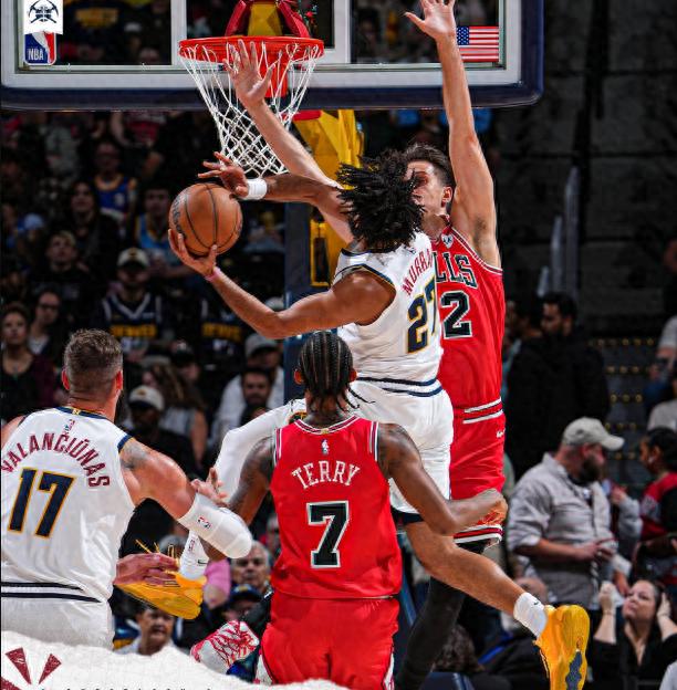 约穆组合上来包办4球。对面吉迪连中三分。不过公牛之后长达4分钟没有得分。戈登反击空接暴扣,卡梅隆-约翰逊5罚全中,穆雷又进远投,掘金一波16-0高潮,很快领先到16分,首节以37-29领先结束。第二节穆雷继续爆发,戈登再添2记三分,掘金最多领先到19分。吉迪在最后一分钟带队打出7-0高潮,上半场公牛追到55-67。穆雷半场得到21分。吉迪19分。