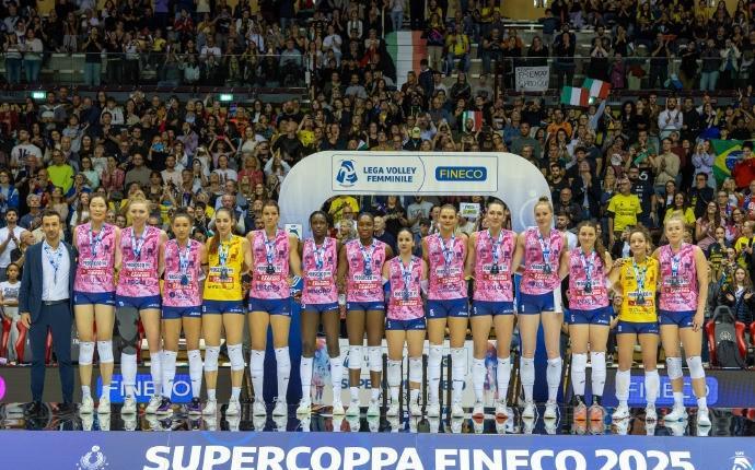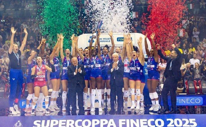 10月18日,2025意大利女排超级杯:米兰3-2(18-25、25-22、25-20、13-25、15-12)力克科内利亚诺,结束了后者自2019年以来的霸业并夺得俱乐部首个超级杯。埃格努30分(决胜局独得10分)荣膺MVP、拉涅尔14分,哈克32分、西拉11分、朱婷10分(37扣9中1拦)。科内利亚诺在国内赛事连夺18个冠军,超级杯7连冠纪录被终结,自2019年2月以来在国内“争冠赛”未让冠军旁落的金身被破。