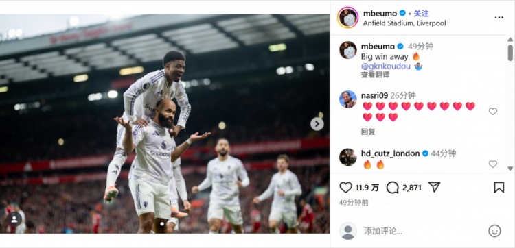 闪击破红军!姆伯莫社媒庆祝胜利:关键的客场胜利